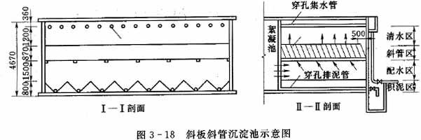 斜管斜板式沉淀池的結構與一般沉淀池相同,是由進口、沉淀區、出口與集泥區四個部分組成,只是在沉淀區設置有許多斜管或斜板。圖3-16為斜管式沉淀池的典型結構。